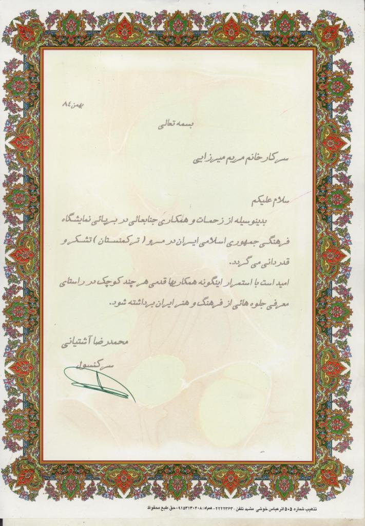 In 2005, Maryam Mirzaei was invited to Marv & Ashkhabad-Turkmenistan to exhibit her work as part of the exhibition of Iranian Art and Culture.